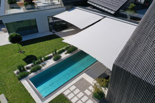 Die Sonnensegel wurden elektrisch aufrollbar konzipiert, um den Bedienkomfort zu erhöhen und eine flexible Nutzung zu ermöglichen. Ein wichtiges Anliegen des Kunden war es, dass die Rasenfläche unberührt bleibt. Daher wurden die insgesamt fünf Masten, die das Segeltuch spannen, in 18 Metern Entfernung aufgestellt.