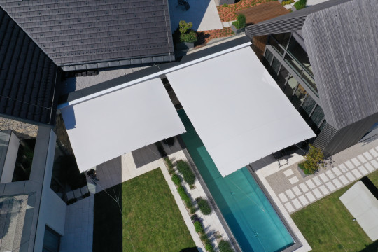 Das Projekt Zebra Square bietet eine Vielzahl von Vorteilen, die es von herkömmlichen Beschattungssystemen abheben. Die großen Größen der Sonnensegel bieten einen umfassenden Sonnenschutz für die gesamte Terrasse und den Poolbereich. Die Sonnensegel wurden so konzipiert, dass sie auch die Fensterfronten des Haupthauses und des Anbaus vor direkter Sonneneinstrahlung schützen. Dies trägt dazu bei, die Innentemperaturen der Gebäude zu senken und Energie zu sparen.